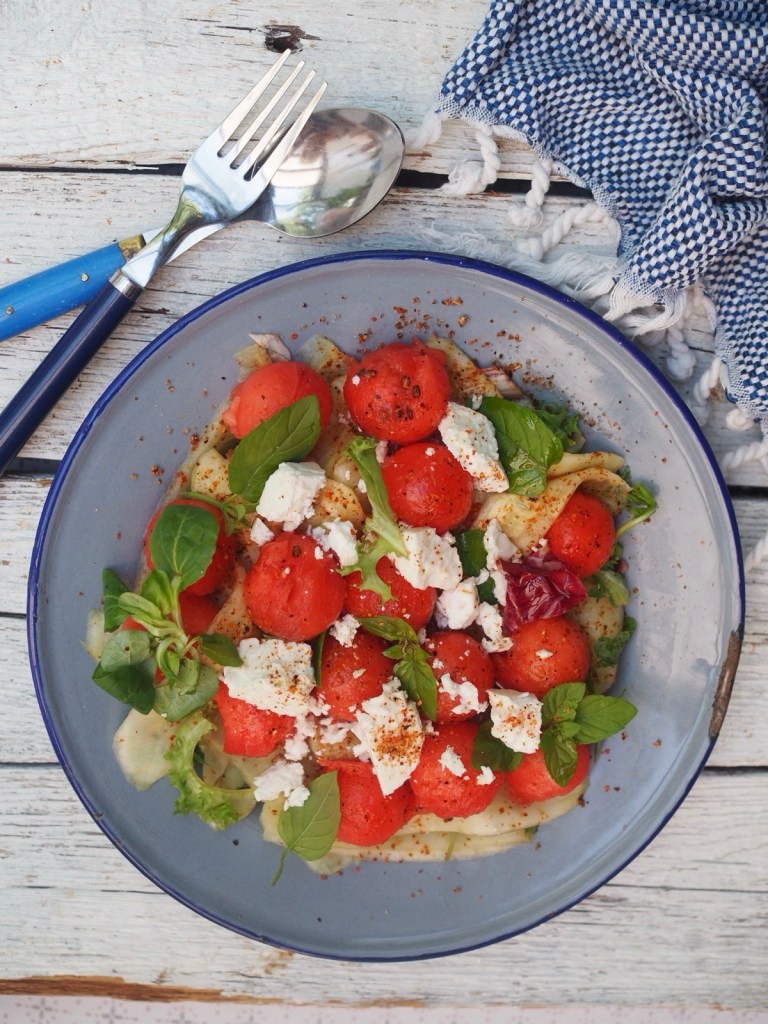 Puolita tai kuutioi pestyt tomaatit. Halkaise avokado, poista kivi, irrota hedelmäliha kuoresta ja viipaloi se. Asettele ainekset salaatin päälle.