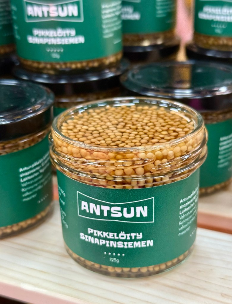 Törmäsin huhtikuisilla Ruokamessuilla Helsingin Messukeskuksessa Antsun pikkelöityihin sinapinsiemeniin ja olin myyty. Kotimaisista sinapinsiemenistä tehdyt napakat ja hieman poksuvat siemenet koukuttivat heti. Tuote on vegaaninen ja sitä kutsutaan sinappikaviaariksi. Sitä voi tilata linkin verkkokaupasta.