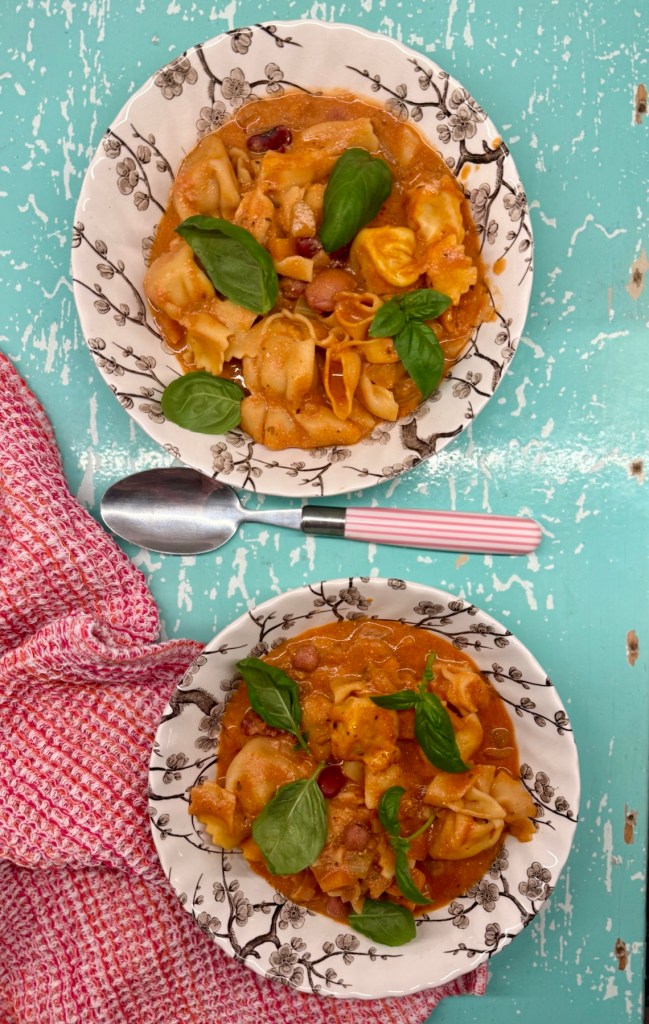 Pakkaspäivään sopivat lämmittävät Välimeren maut ja tortelliinit sopivat täydellisesti kasviskeittoon! Valmiit tortelliinit tekevät keitosta täyttävän ja nopea. ruoan. Proteiinina vegeruoassa on papuja, mutta niiden asemesta ruokaan voi käyttää vaikka mausteista makkaraa tai kypsää broileria.