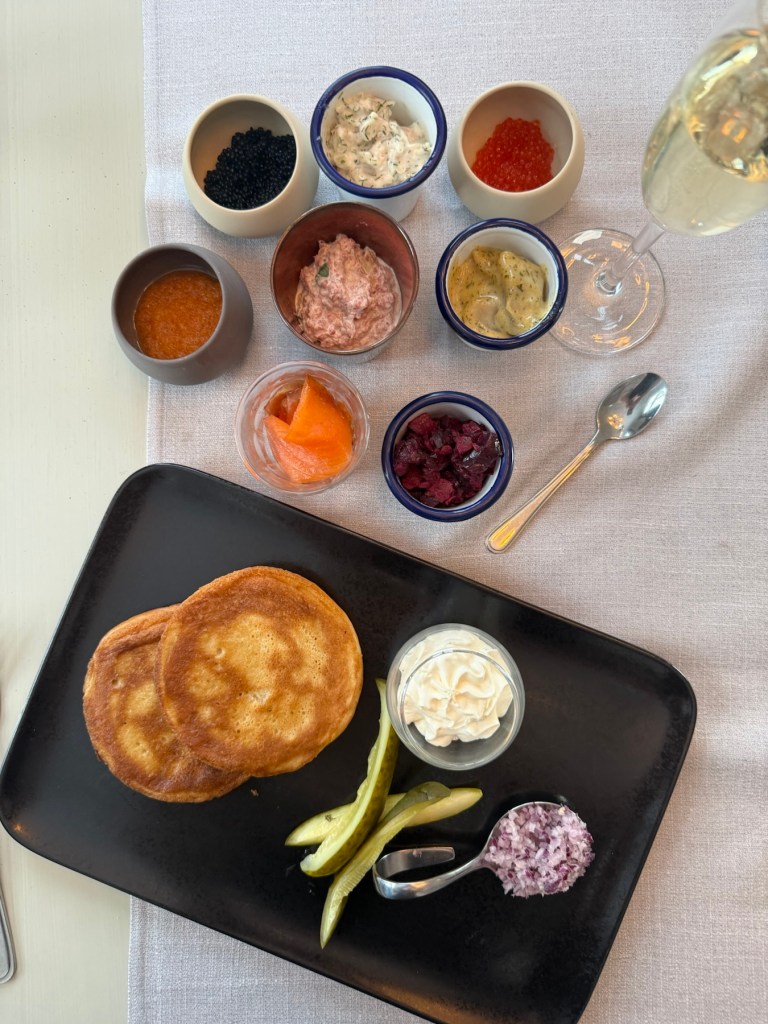 Tattarijauhoista valmistettujen blinien kaveriksi on mahdollista valita kaksi kahdeksasta erilaisesta täytteestä. Lisätäyte maksaa viisi euroa. Isommalla porukalla kannattaa ottaa jaettavaksi erilaisia täytteitä. Niistä kun riittää maisteltavaksi useammallekin. Oma suosikkini oli savuporotäyte ja punajuuri-tattitartar. Klassikothan toimivat sina, mutta tämä makupari hurmasi minut täysin.