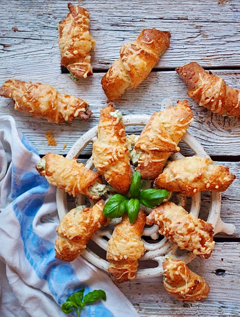 Jaa levy kahdeksaan kolmion muotoiseen osaan taikinapyörällä. Laita jokaisen kolmion leveään reunaan 1 tl fetatäytettä. Rullaa kolmiot sarviksi aloitten leveästä reunasta.