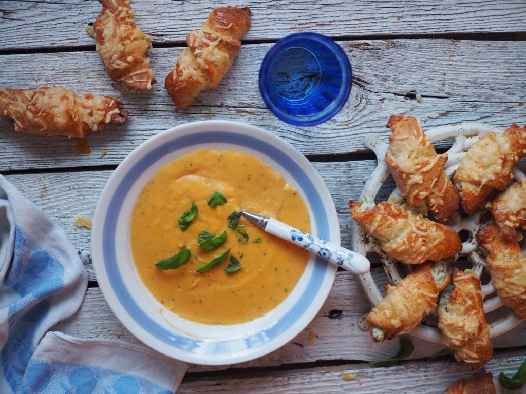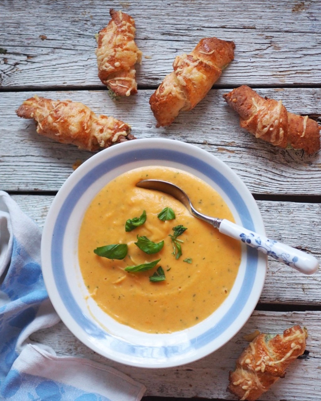 Lisää keiton pinnalle hienonnettua basilikaa tai persiljaa.