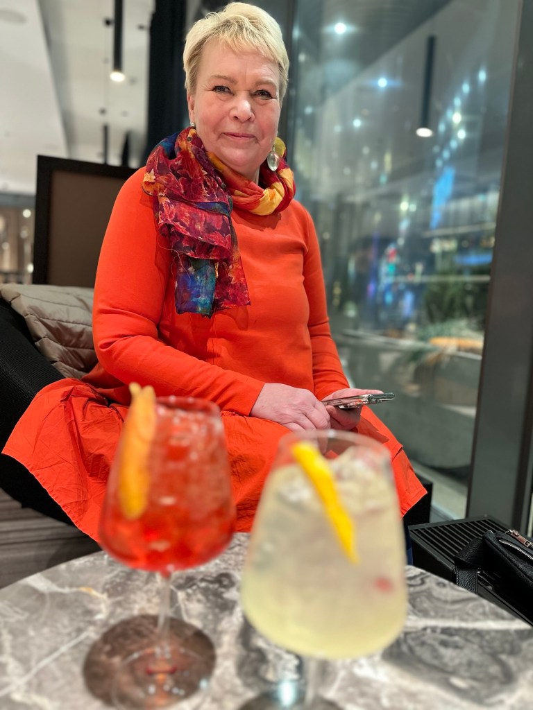 Teatterista kävelimme Tallink Cityhotellille, jonka baarissa nautimme todella erinomaiset mocktailit. Kaisa joi mocktailin nimeltä Lemon Shores, jossa oli baarin kotitekoinen sitruunainen makusiirappi. Minä join Grodino Sprizin, italialaisen klassikon, joka ei todellakaan prosentteja kaivannut.