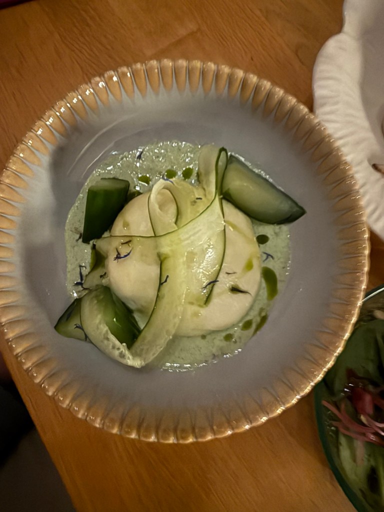 Burratatyylinen kurkkusalaatti, matsoni-kastike.