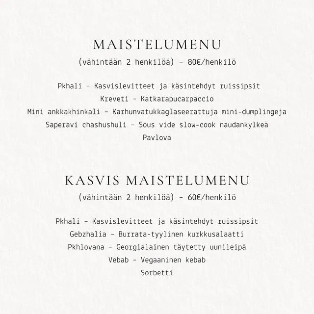 Luka Khinkladze lähestyy georgialaista ruokaa ja keittiötä perinteitä kunnioittaen, mutta modernilla otteella. Khinkladze on tällä hetkellä erityisesti kiinnostunut kulinaarisesta taiteesta ja moderneista ruoanvalmistustekniikoista. Kannattaa käydä vilkaisemassa miehen Instagram-sivu @lukkgram.