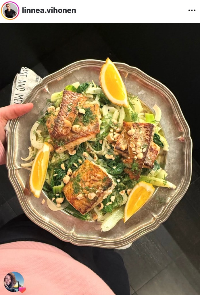 Pääruokana oli Linnea Vihosen ohjeella valmistettua kuhaa. Herkullisen keväistä. Tosin pohdimme syödessämme, että vaihtaisimmeko ohjeen hasselpähkinät paahdettuihin pinjansiemeniin, kun yksi meistä on pähkinöille allerginen .