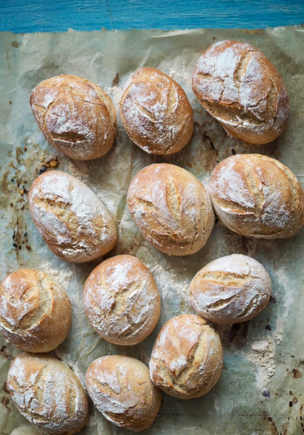 Jaa taikina jauhotetulla pöydällä 9-12 osaan ja pyörittele sämpylöiksi, kasta vehnäjauhoihin ja laita leivinpaperin päälle uunipellille.