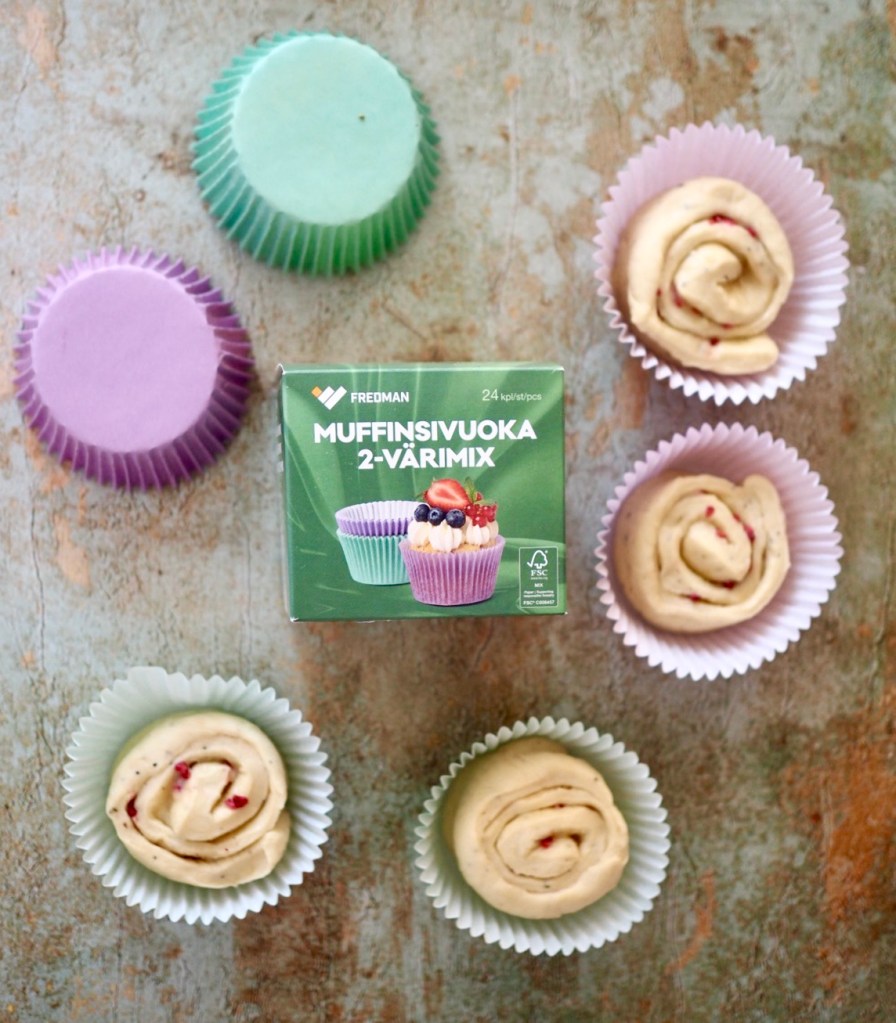 Kääri rullaksi kuin kääretorttu, jätä saumakohta alle. Leikkaa rulla 12 palaan. Nosta pullat muffinivuokiin leikkauspinta ylöspäin.