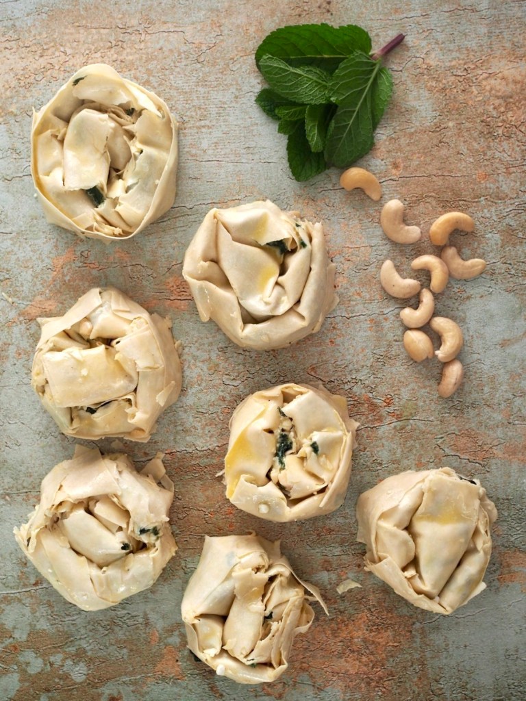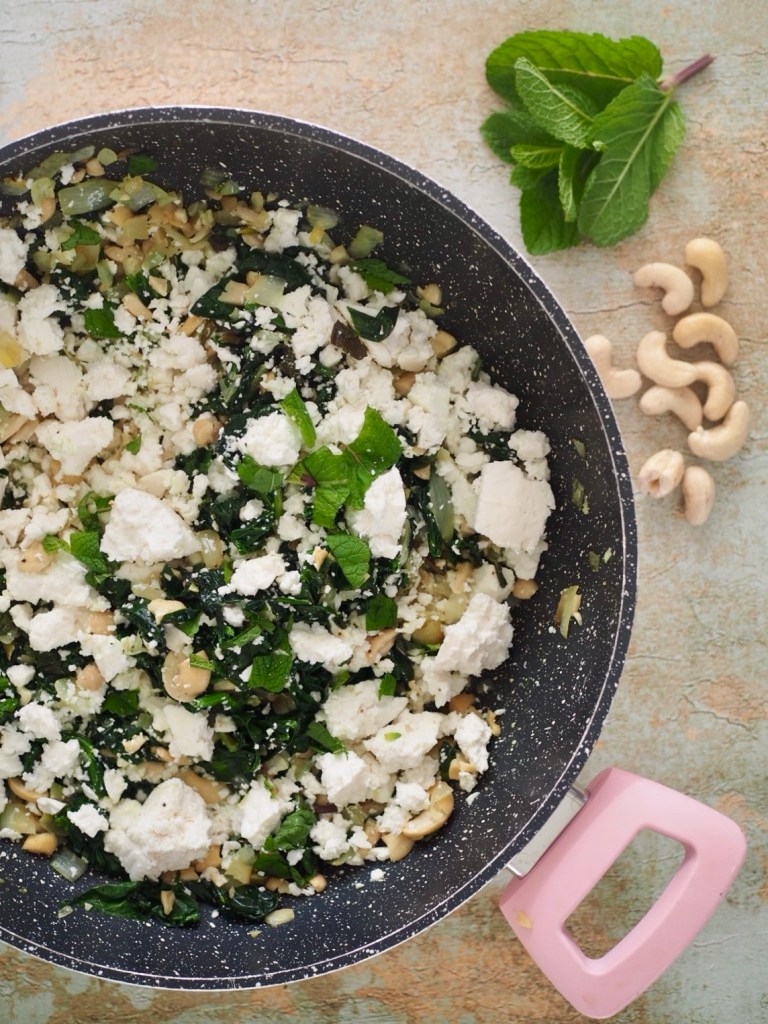 Lisää pinaatin joukkoon murennettu fetajuusto, hienonnetut pähkinät ja silputtu minttu.