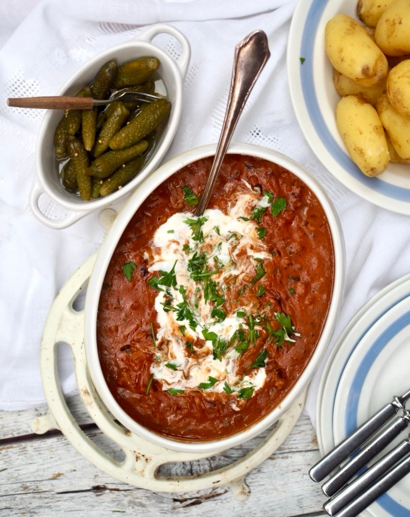 Täyteläinen liharuoka, jossa lampaan- ja naudanjauheliha yhdistyvät anjovikseen, sipuliin ja tomaattipyreehen. Uunissa kypsyvä pata saa syvän ja aromikkaan maun, ja halutessasi sen voi soseuttaa tasaiseksi tahnaksi. Tarjoiltuna uuniperunan, punajuuren, suolakurkun ja smetanan kanssa syntyy klassinen ja ruokaisa kokonaisuus.