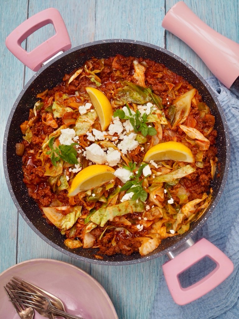 Raikas ja täyteläinen pannuruoka, jossa lampaan jauheliha saa rinnalleen makean varhaiskaalin ja kreikkalaisille mauille tyypilliset yrtit ja mausteet. Paistettaessa maut syvenevät ja kaali pehmenee meheväksi, jolloin lopputuloksena on helppo mutta aromikas arkiruoka, jossa yhdistyvät keväinen keveys ja täyteläinen maku.