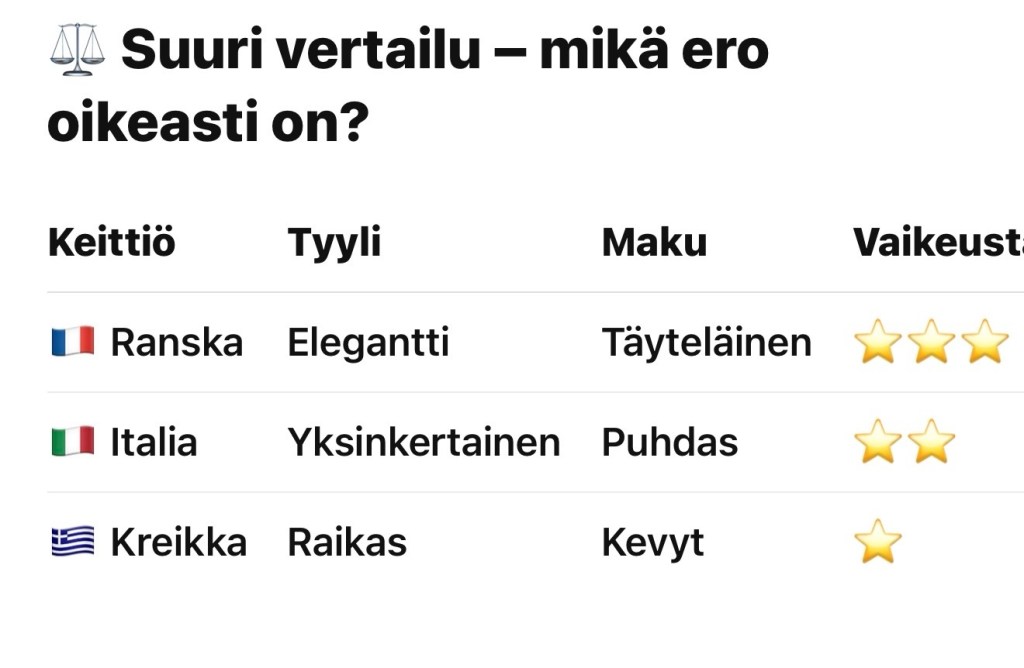 Ranskalainen, italialainen vai kreikkalainen keittiö? Kaikki kolme ovat Välimeren alueen ruokakulttuureja, mutta niiden tyyli, maut ja filosofia ovat hieman erilaisia.