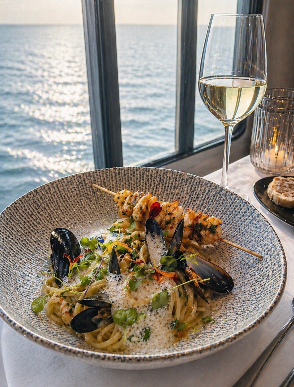 Pääruoka alkoi viinistä. Jean Leon 3055 Chardonnay tarjoiltiin ennen simpukka- ja jättikatkarapupastaa. Nimi 3055 viittaa Jean Leonin New Yorkin taksiluvan numeroon – muistoon ajasta ennen ravintola- ja viiniuraa. Viinin pyöreys ja merelliselle pastalle sopiva rakenne tekivät parista erityisen onnistuneen.