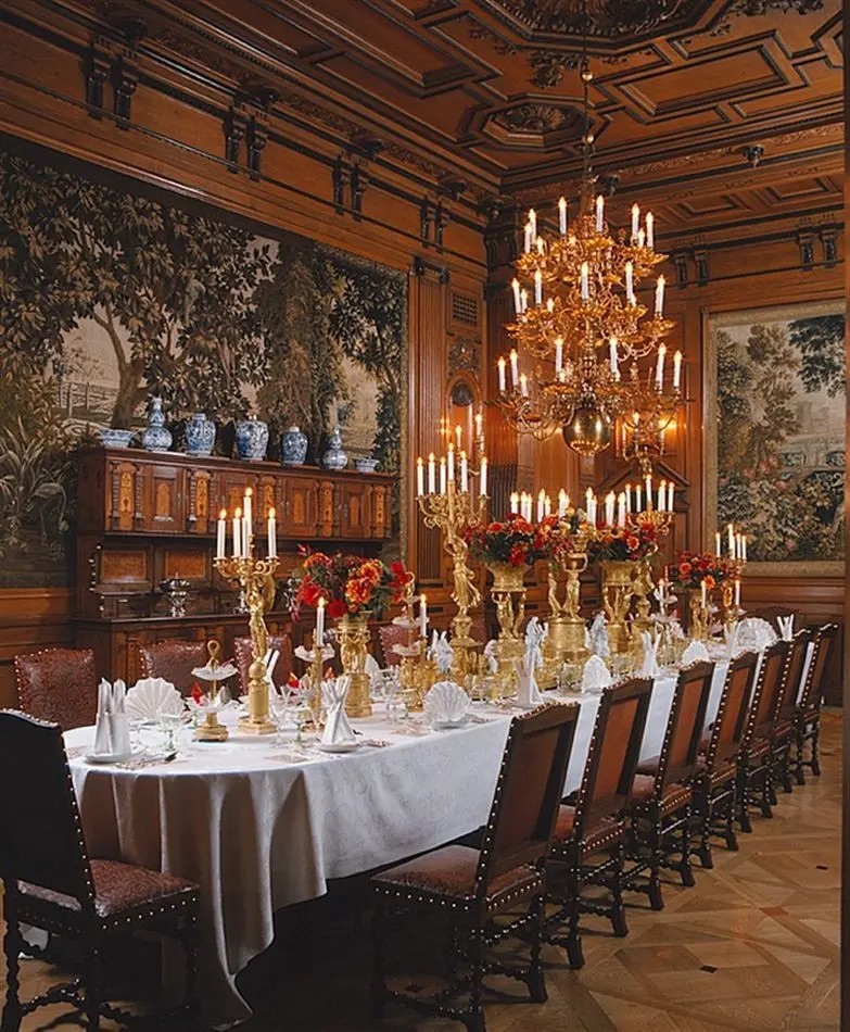 Pitkä pöytä voitiin kattaa noin 30 vieraalle, ja muodollisilla illallisilla muusikkoparvella soitti orkesteri.