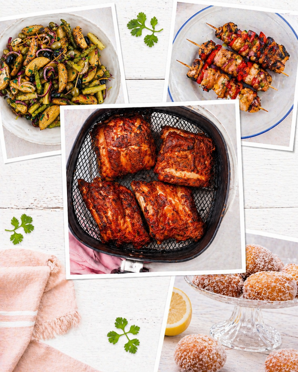 Vappuun kuuluu munkit, naposteltavat ja jotain grillihenkistä, vaikka sää ei suosisi ulkokeittiötä. Näillä airfryer-ohjeilla syntyy vappumenu, jossa on vähän retroa, vähän bbq-fiilistä ja paljon helppoutta. Mukana on myös vappuklassikoita uudella twistillä – perunasalaatti lämpimänä ja munkit ilman uppopaistoa.